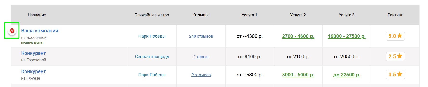Иконка 16х16 пикселей будет отображаться слева от названия вашей компании в таблицах, выделяя её среди прочих. Опция увеличивает вероятность перехода на страницу компании и рекомендуется в качестве дополнения к прочим методам продвижения, в первую очередь для компаний с узнаваемым брендом.